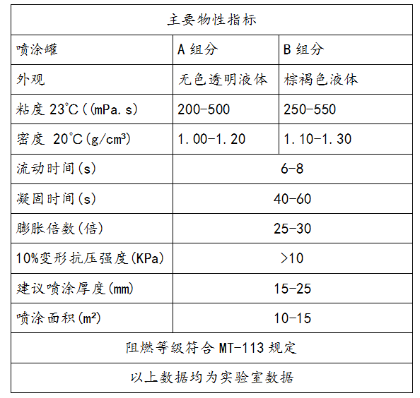 旺财28喷涂罐是一种双组分改性聚合物材料,由树脂和固化剂组成。双组分材料分别预置于两个耐压贮罐中,保持一定的压力。使用时当贮罐中的材料在压力作用下经过喷枪的混合后,喷至井下密封目标物上,双组分材料迅速反应、膨胀,并由粘性物转变成高阻燃型泡沫固结体,利用材料优异的附着性能与密封目标物牢固粘结,且该材料属于柔性材料,受压形变,但不会出现脱落、开裂现象。该产品阻燃性能优异,使用安全可靠。
